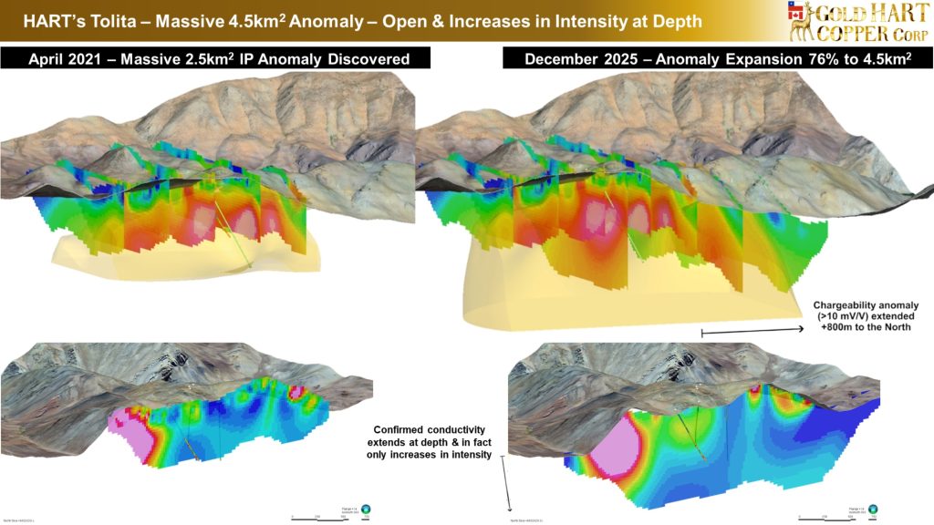 Following Gold Hart’s acquisition of the property, a comprehensive geophysical survey identified a large, near-surface, high-chargeability and conductive anomaly interpreted as a copper-gold porphyry system. Subsequent diamond drilling in 2025 confirmed the presence of a fertile porphyry system, characterized by multi-generation stockwork veining, multiple alteration styles, and increasing potassic alteration at depth.