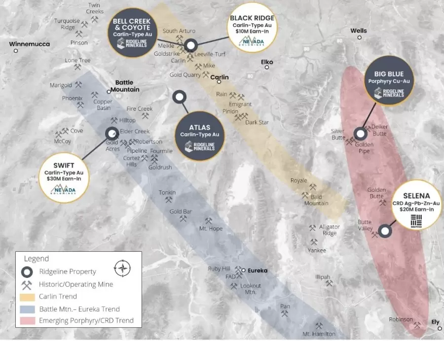 Ridgeline Minerals Corp. is a mineral exploration company headquartered in Vancouver, British Columbia. The company manages a 200 km² exploration portfolio in Nevada and operates under a hybrid business model, combining wholly owned assets with strategic partnerships through earn-in agreements.